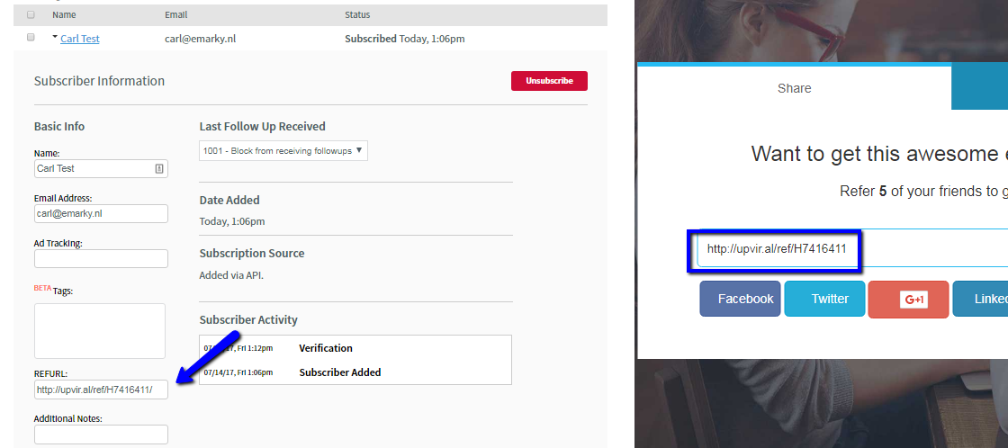 By doing this, UpViral can send over the referral links along with your leads' name and email information to your autoresponder list. Since you have this information on your autoresponder now, you can craft follow-up emails from your own auto-responder that includes your leads' unique referral link!