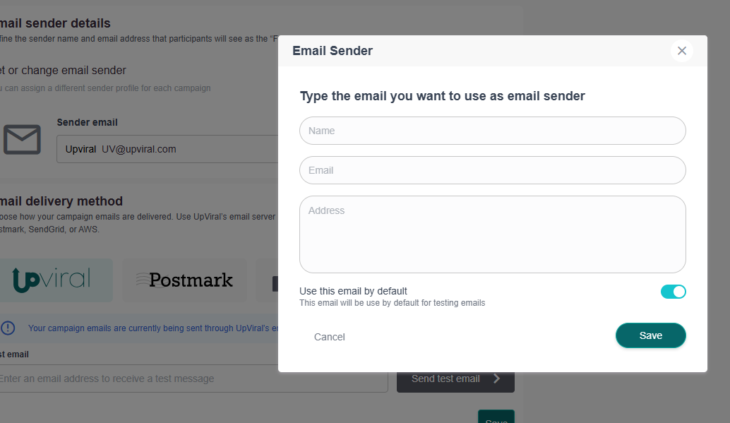 To create Sender Profile, open your UpViral campaign and go to Emails > Add Email: