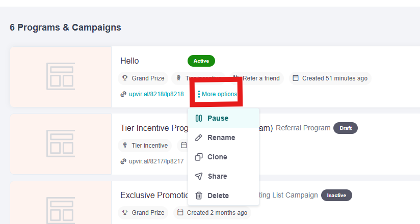 1. Log in to UpViral. Search for your campaign. Once you've found it, click More Options and then click on Pause from the options to close the campaign: