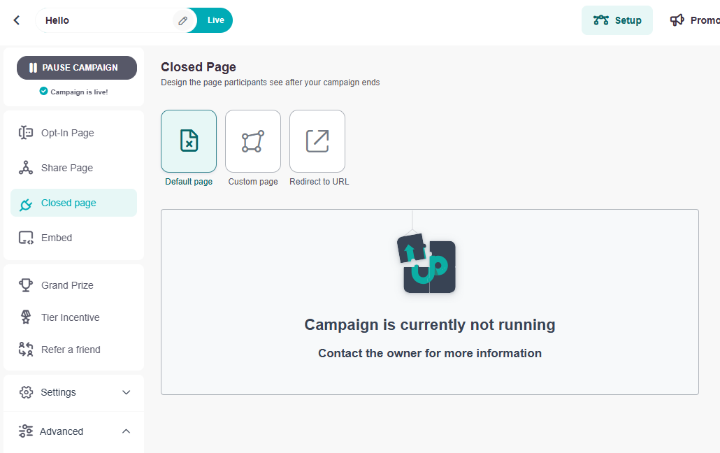 3. Inside your campaign setup, you can also create a page for your closed campaign, create a custom page for it (using UpViral's templates), or redirect to a custom URL: