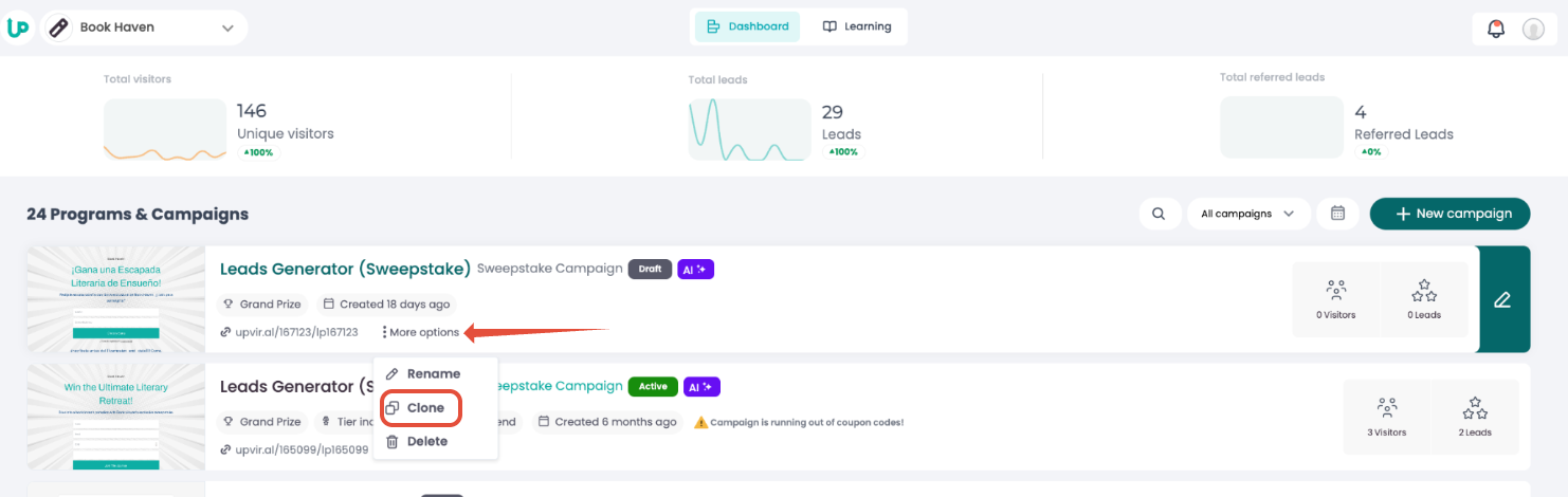 1. Log in to your UpViral dashboard. Right below your campaign name, click More Options. Then click Clone from the drop-down list: