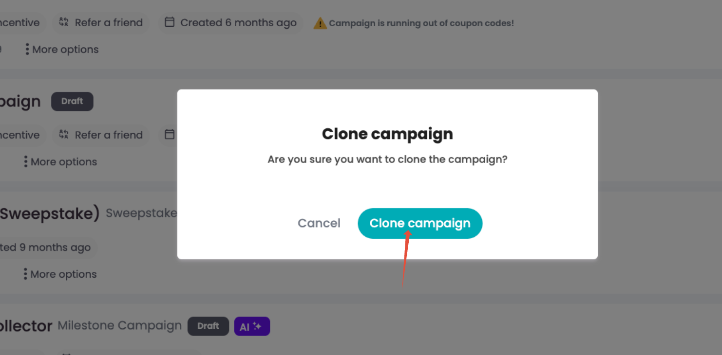 2. A pop-up window will show to verify whether you really want to clone the campaign. Click on the "Clone Campaign" button.