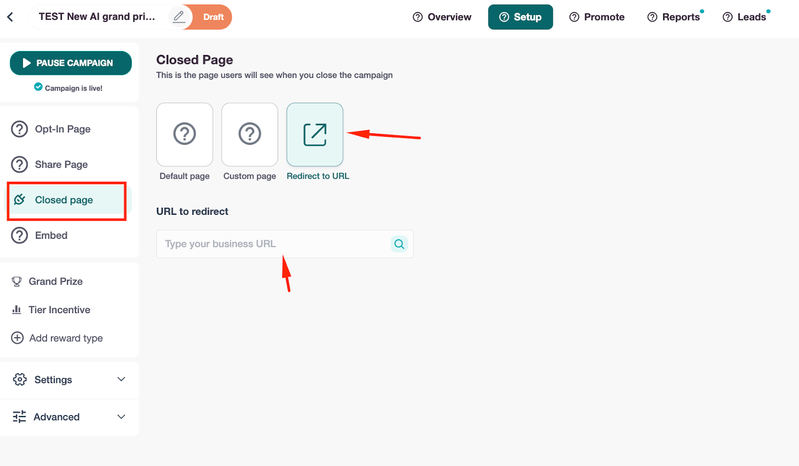 For the "Redirect to URL" option, click on it, and then enter the URL of the page to which you want to redirect people when they visit your campaign.