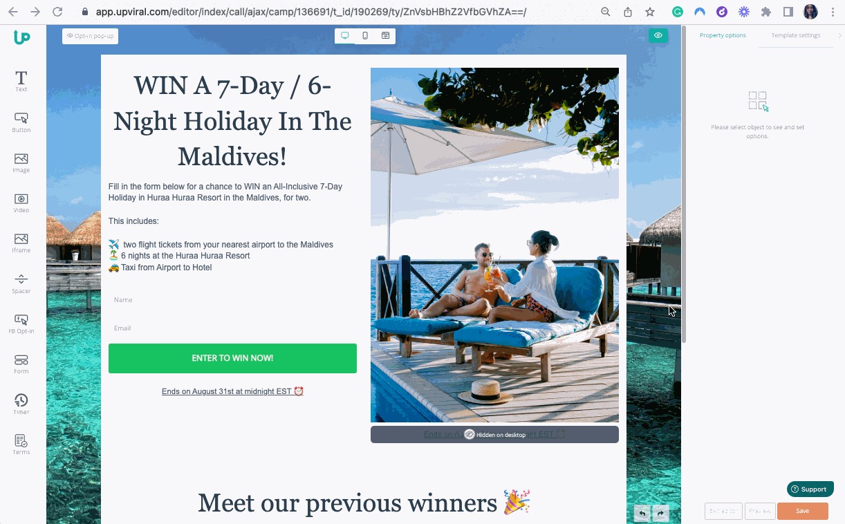 2 - Once inside the template editor, Drag and Drop FB Optin into your template, edit the button based on your preferences on the Property Option then click on Save.