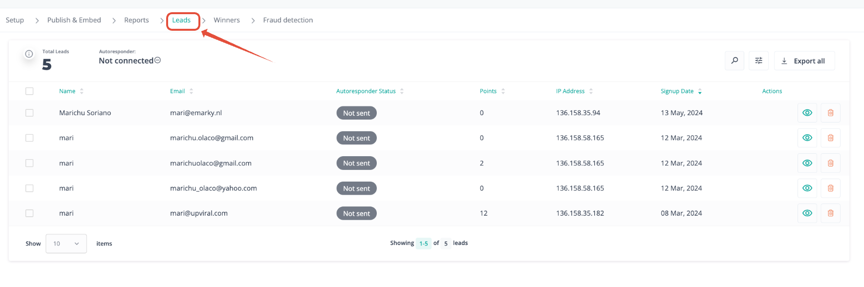 2. Click the "EYE" icon to view lead details and make edits or simply click on the Leads's Email Address. It's important to note that you can only modify points, unlock incentives, blacklist, delete, or designate the lead as a winner; other data cannot be edited or changed.