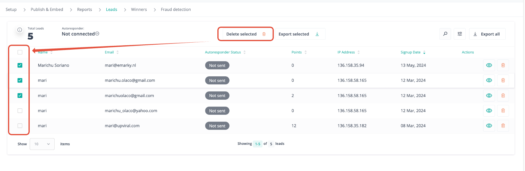 3. Click the upper checkbox to select all leads on the current page, or check individual boxes next to specific leads if you only want to delete certain ones.
