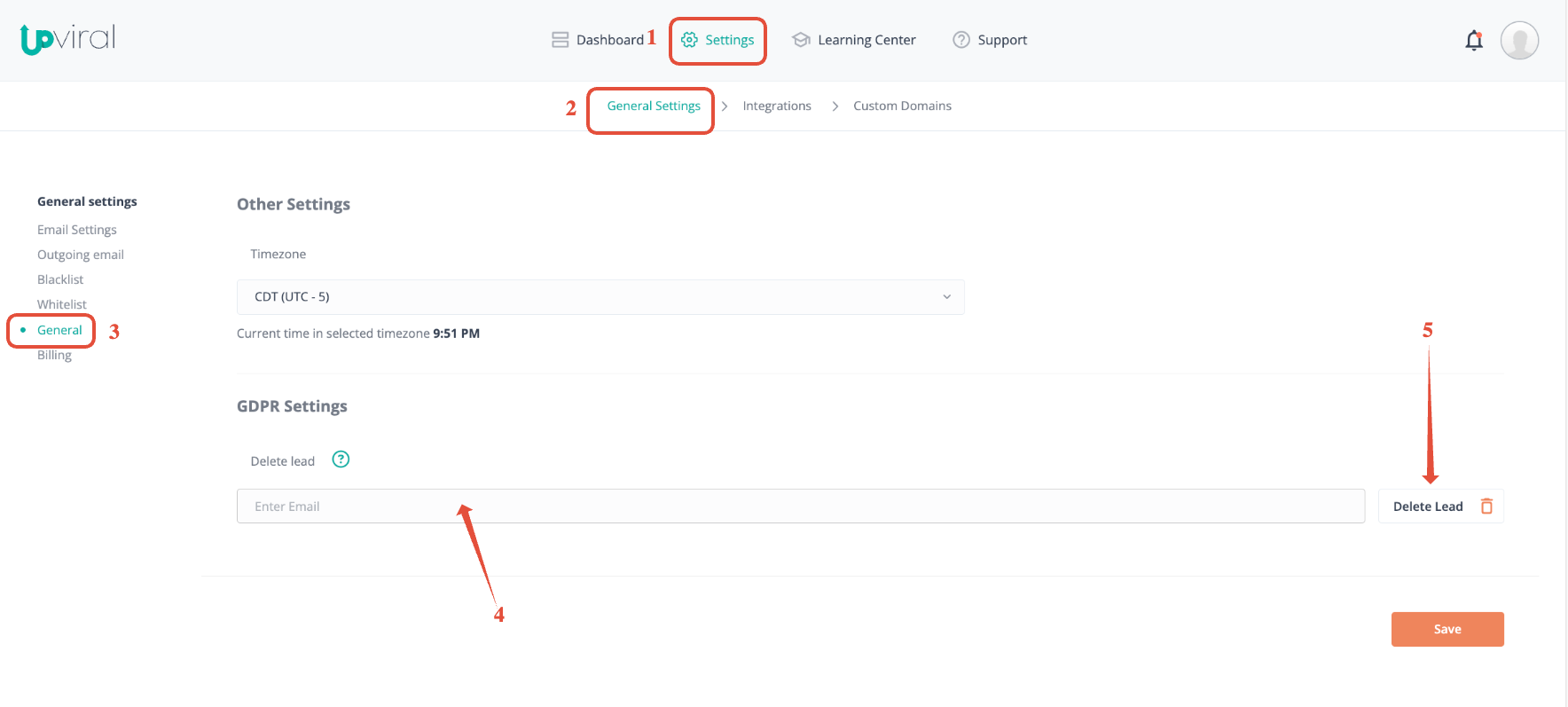 4. If you wish to delete a specific lead from your entire account (for example, when someone asks to be forgotten in line with the GDPR laws), you may do so by accessing Settings from the top menu of your UpViral dashboard. Under General Settings, click Other Settings: