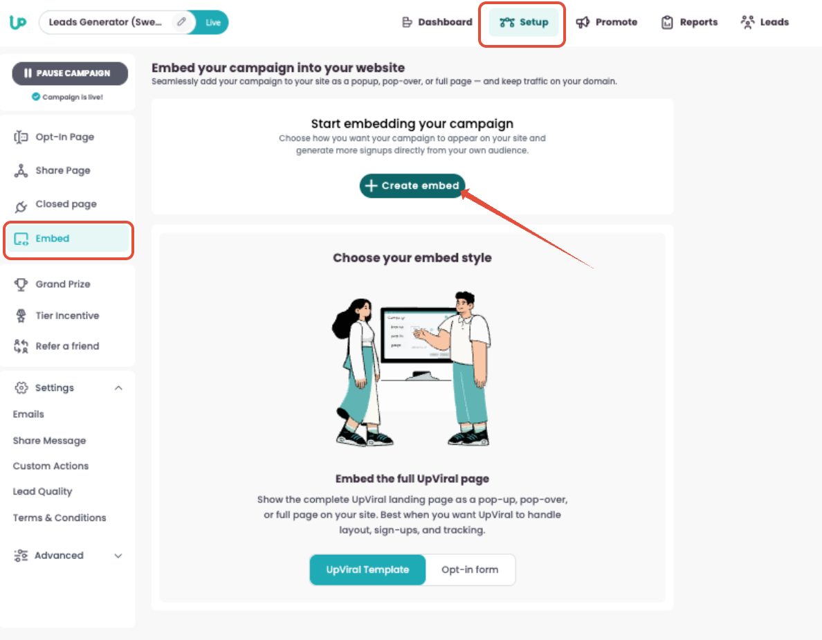 Once you're done setting up your campaign and ready to have integrated into your own page, go to the "Embed” and follow the steps below: