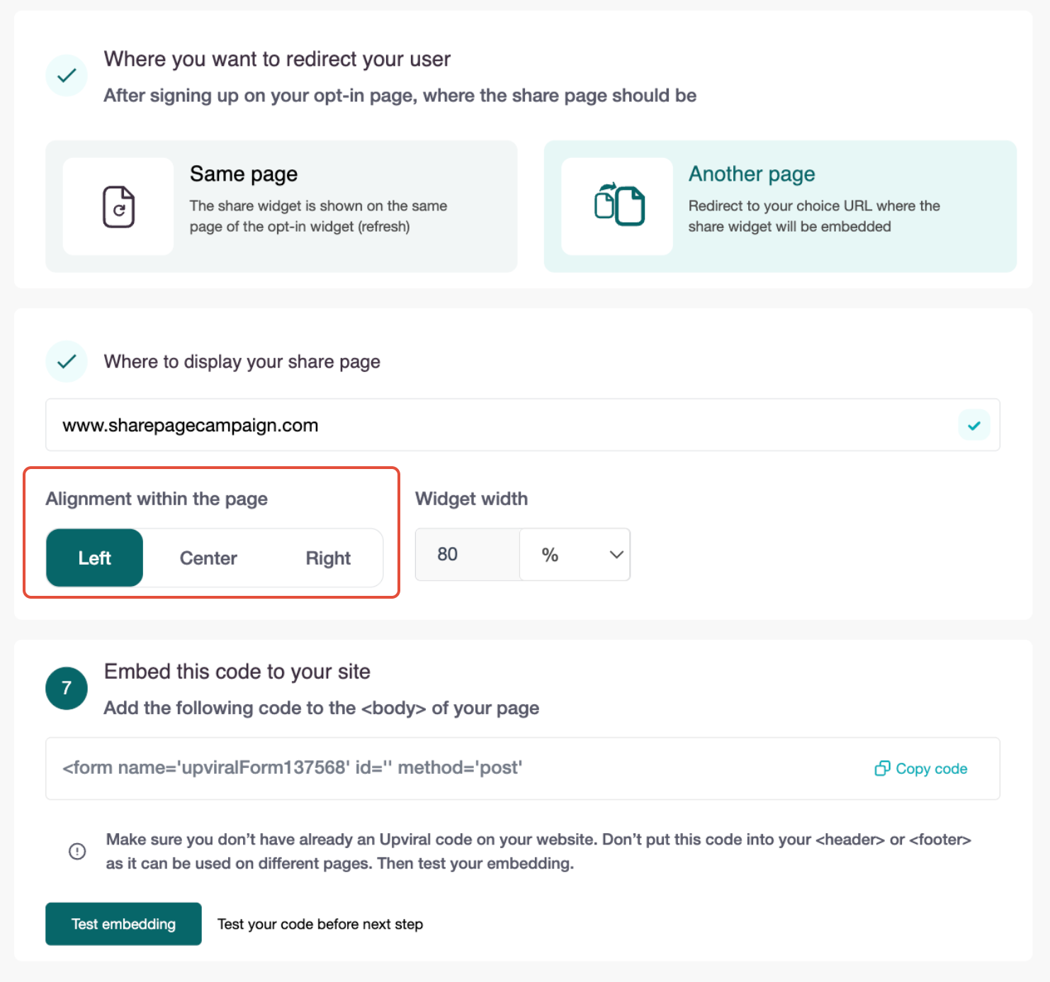 In this article, you'll learn how to position the widget to the left, center, or right side of the page when embedding the UpViral widget onto your site,