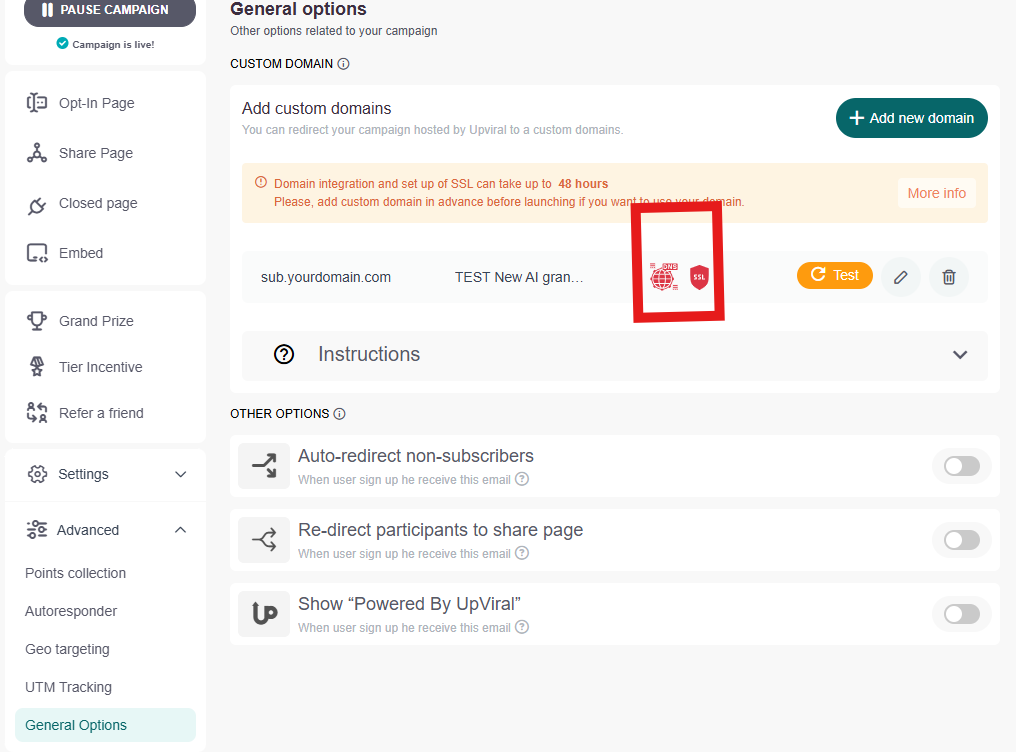 Now we need to check if the SSL is installed or not. So, first go to your campaign and go to Advanced > General Options: