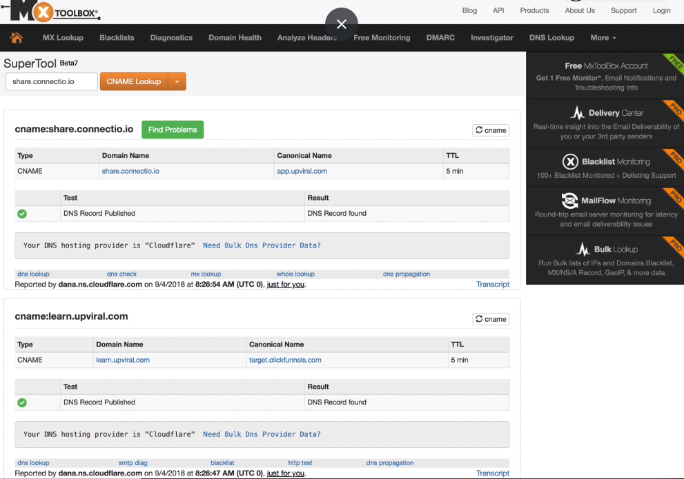 Step 2: Enter your custom domain and hit "CNAME lookup" if you've set it up correctly, you'll see a table with "CNAME" in the first column, and "app.upviral.com" in the 3rd column (see image below).