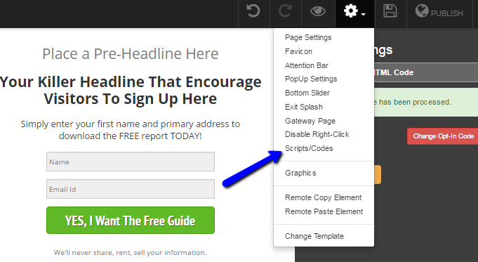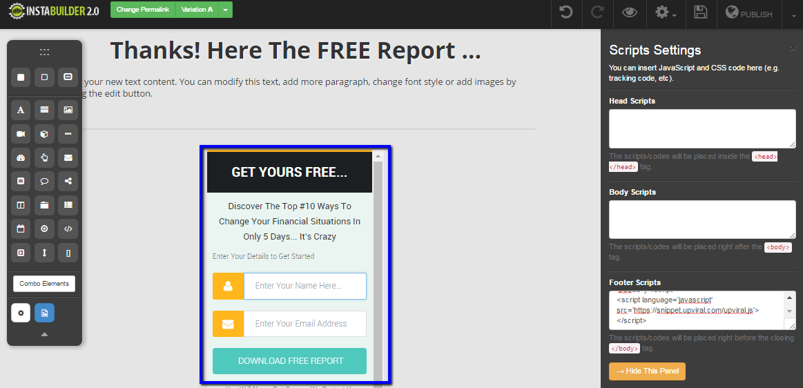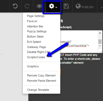 Go back to your Upviral campaign’s Embed page and copy the 2nd code from Step 4 and Add the code to the header or footer of your lead capture page and paste it under Footer Scripts of the Scripts Settings menu.