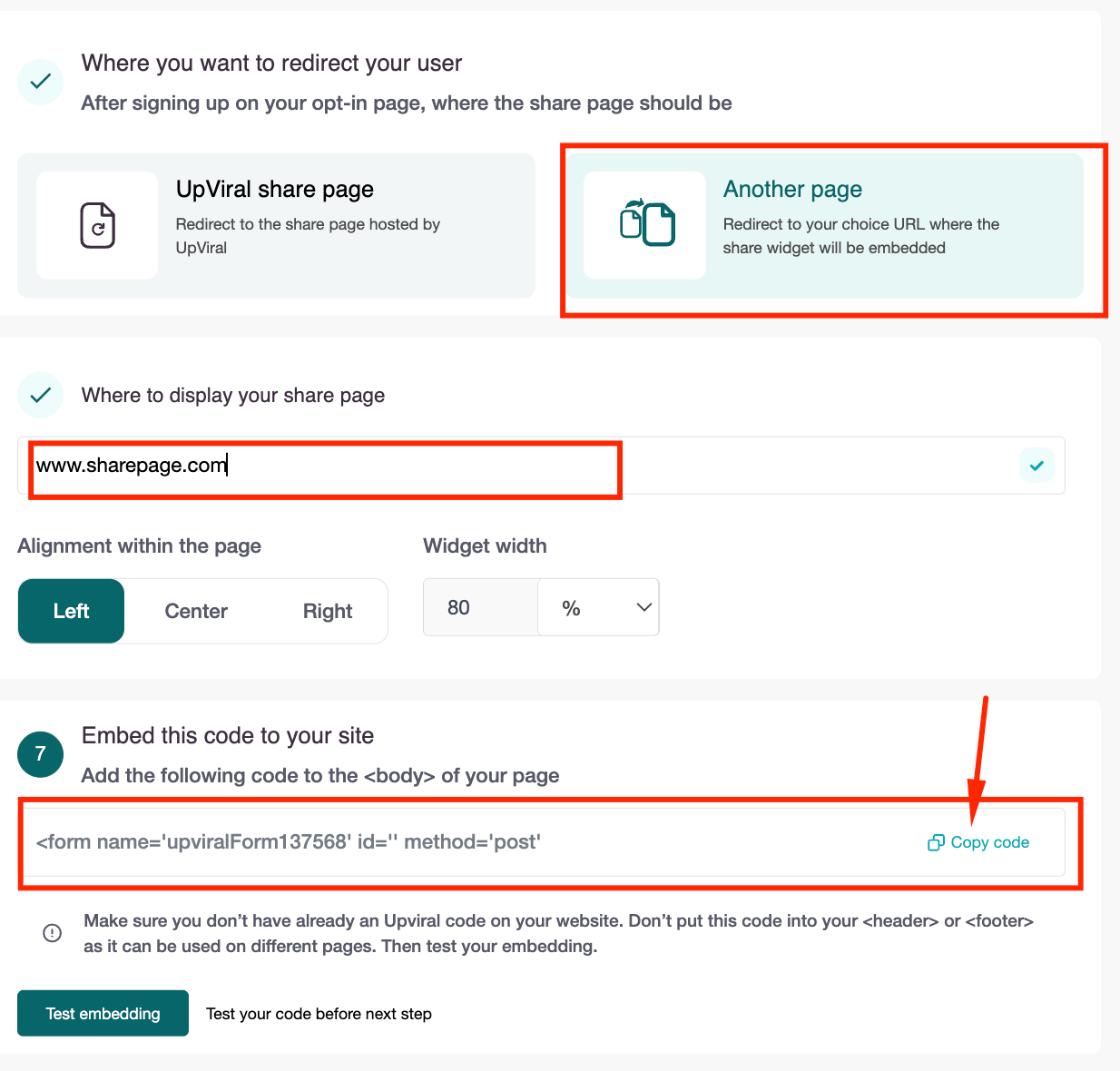 Go back to your Upviral campaigns Embed page. On “Where to Display Your Share Page,” select “Another Page” then specify the Share Page URL, adjust alignment and size, then embed the provided code into the <body> of your page (not in the <header> or <footer>). Avoid embedding multiple UpViral codes.