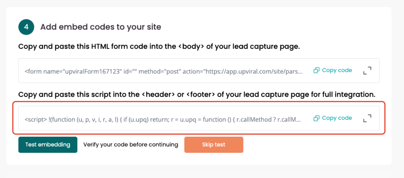 Go back to your Upviral campaign's Publish page > Embed Campaign > Installation then copy the javascript code under 2: Add the following code to the header or footer of your lead capture page. as seen on the blue box.