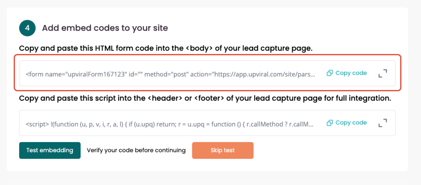 Go to your Upviral campaigns Publish page > Embed Campaign > Installation then copy Code 1 as shown below and Add the following HTML form code into the ‹body› tag of your lead to the box under Step 2: Insert HTML code.