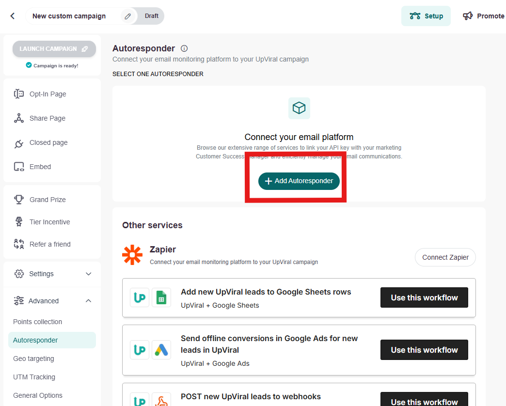 You will need to integrate your Autoresponder into UpViral first on the "Settings" tab.