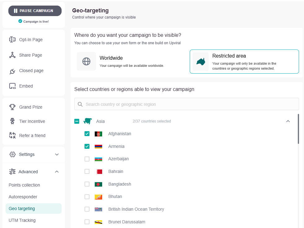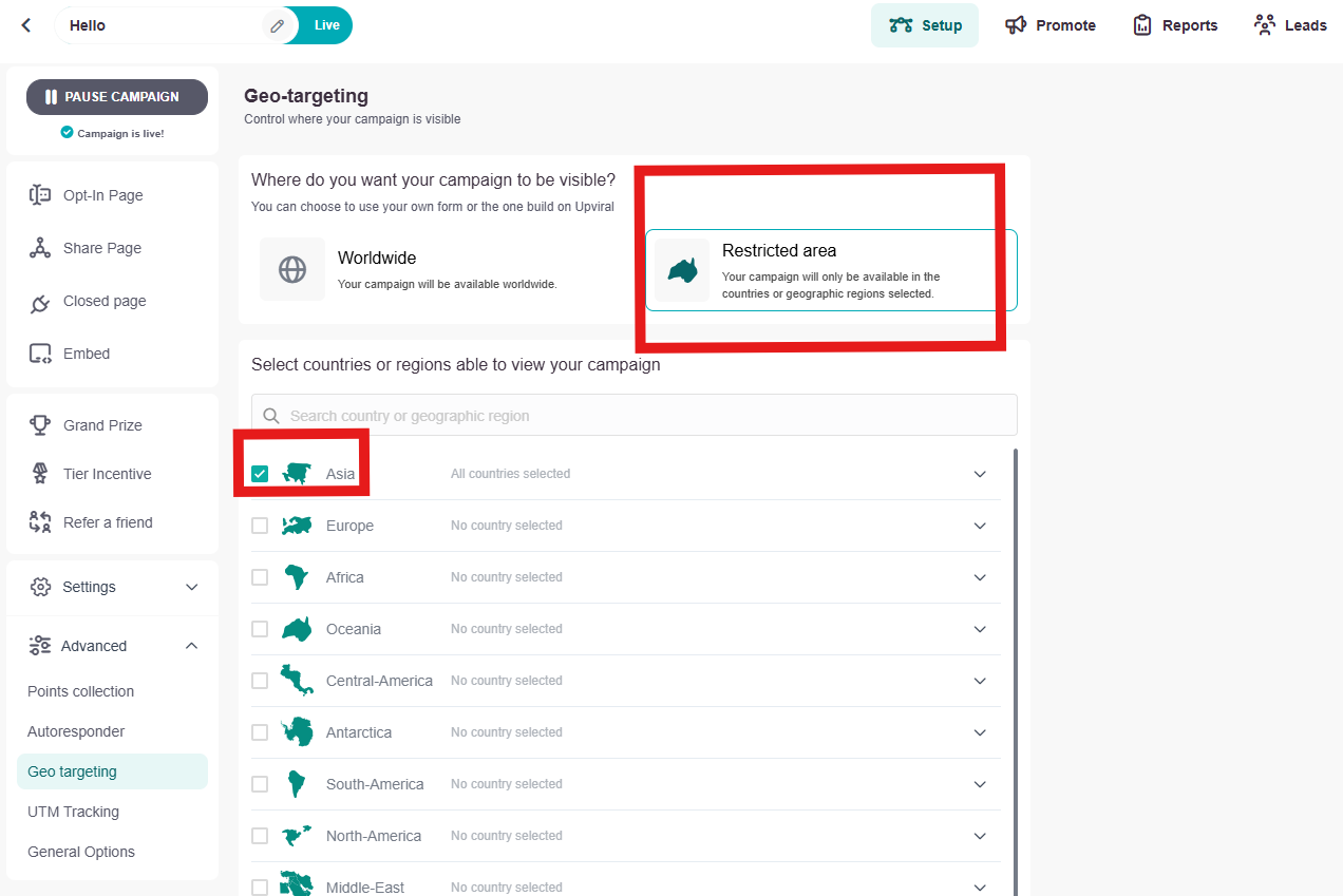 In this example above, all countries in Asia and Oceania will be able to enter the campaign: