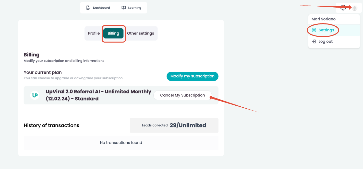 To cancel your subscription, please click on your profile picture in the top-right corner and select Settings from the dropdown menu.