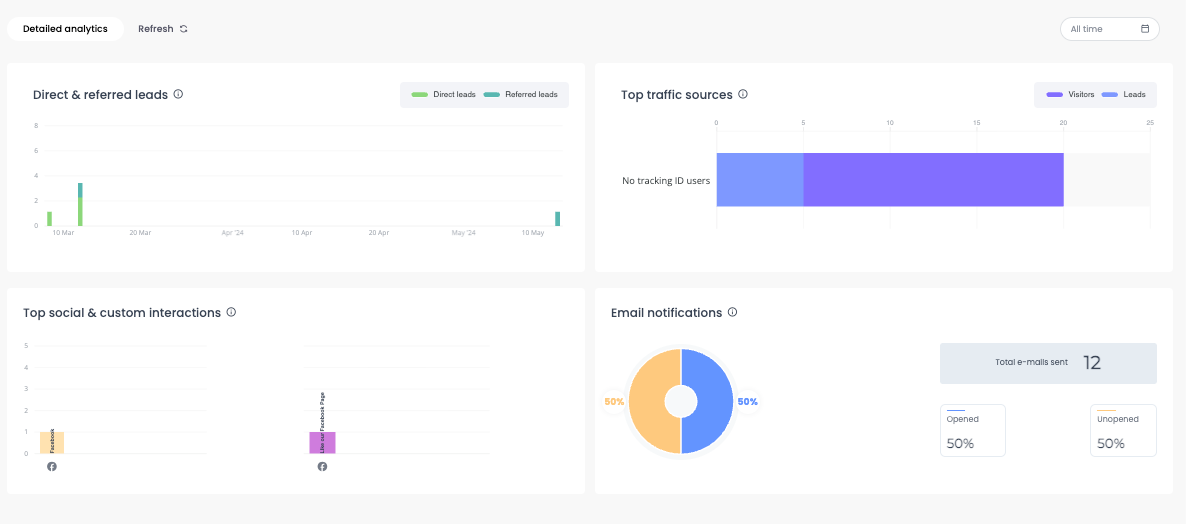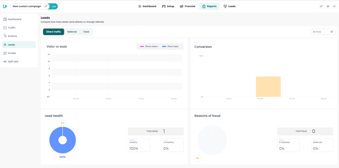 View daily progress of visitors and leads, segmented by direct or referral sources.