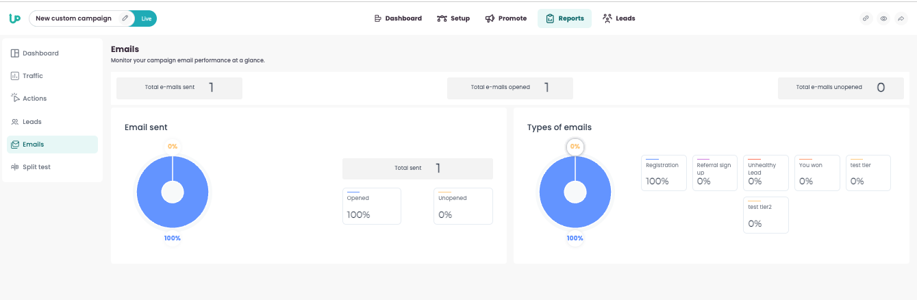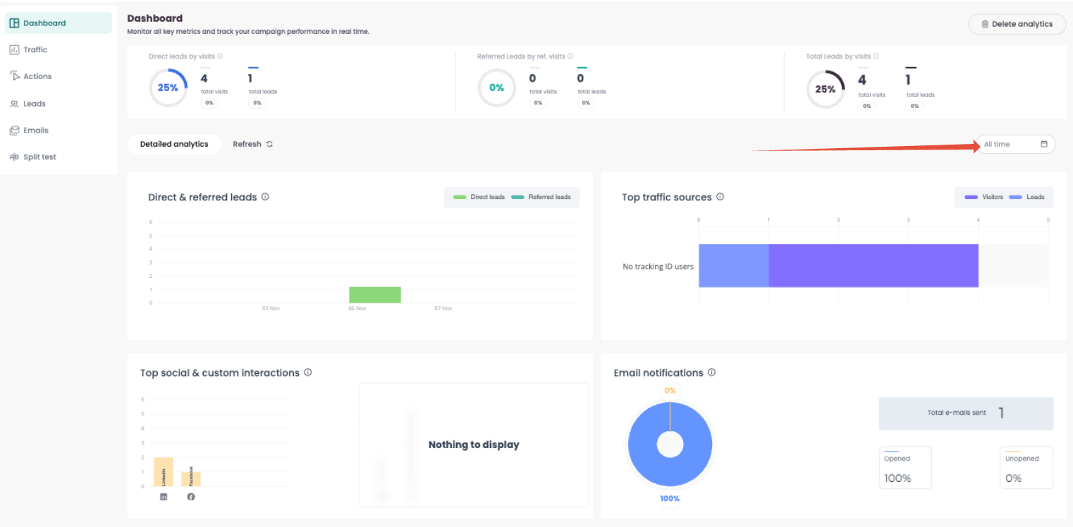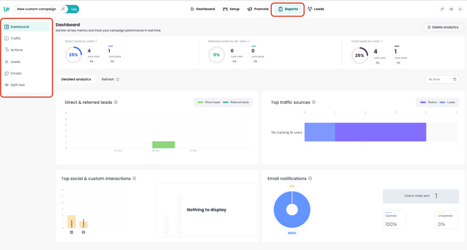 The Reporting Dashboard gives you a clear and comprehensive view of your campaign’s performance. When you first open it, you’ll see a quick snapshot of key metrics, helping you understand how your campaign is performing at a glance.