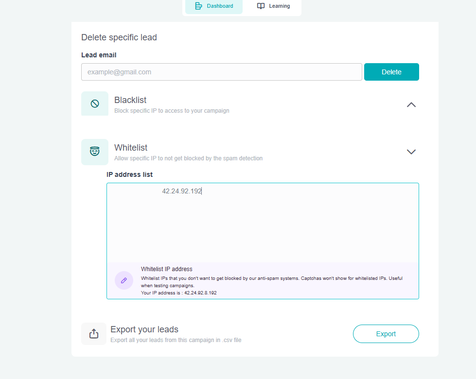 Step 2. Scroll to the bottom and, under Whitelist, add the IP address or IP addresses which you want to whitelist and get rid of the CAPTCHA.