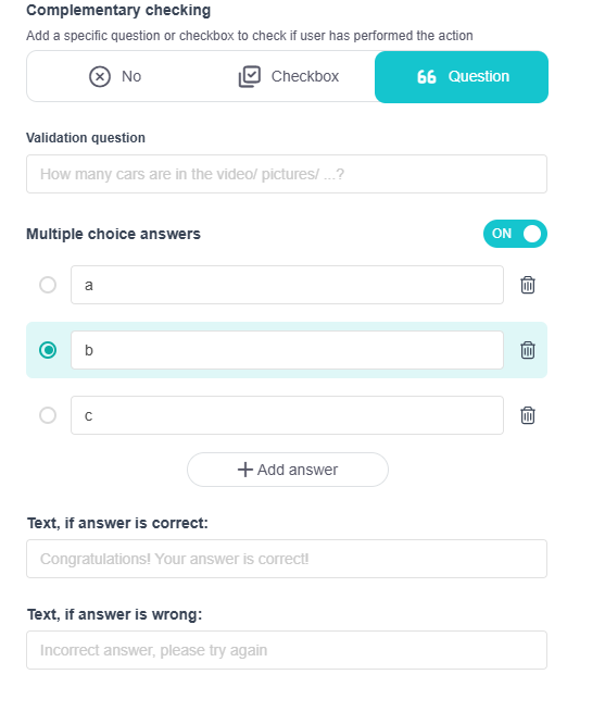 Once a participant has completed a custom action though, in order to get the points allocated for that custom action, they'd need to give the correct answer to your confirmation question: