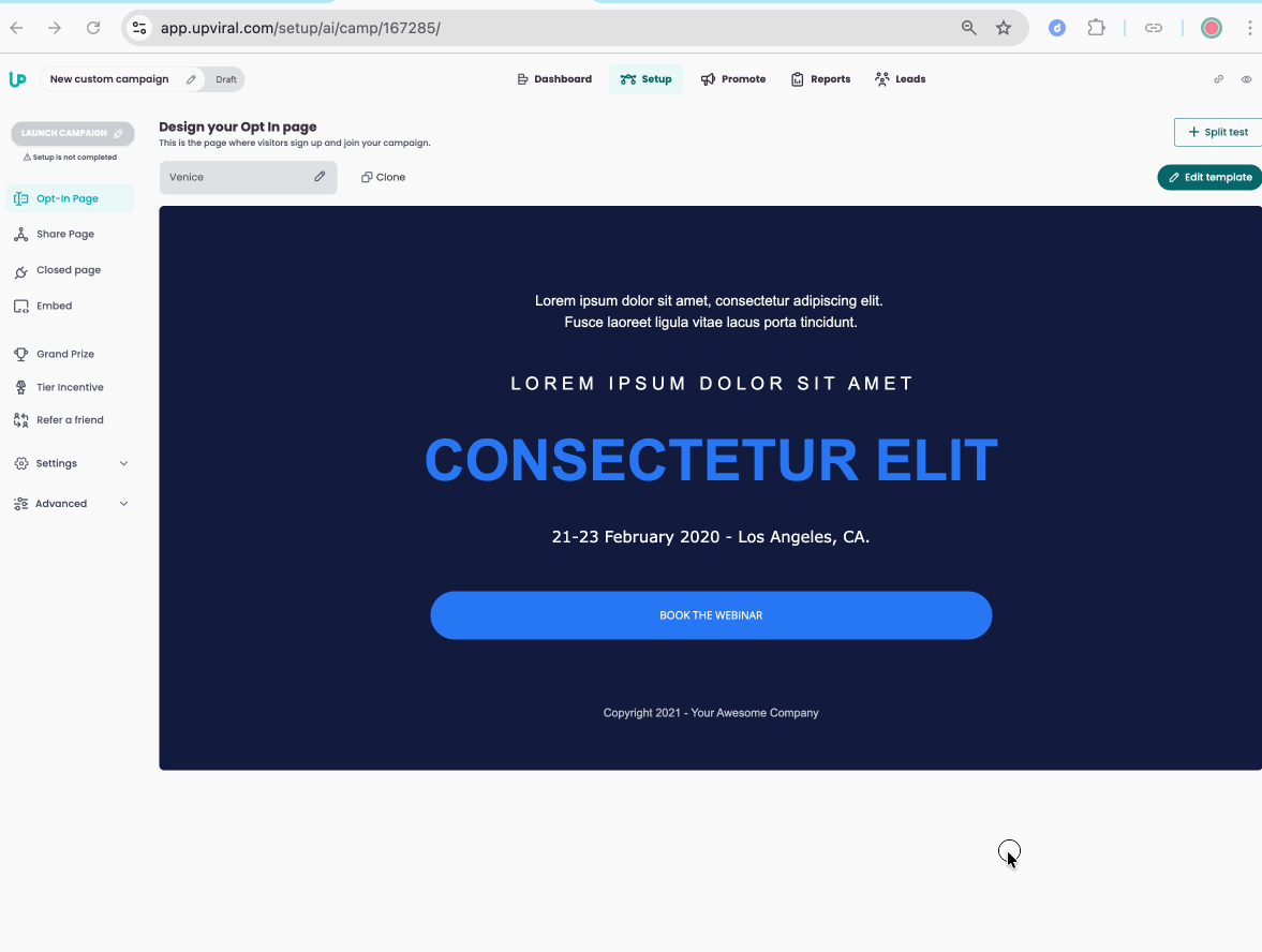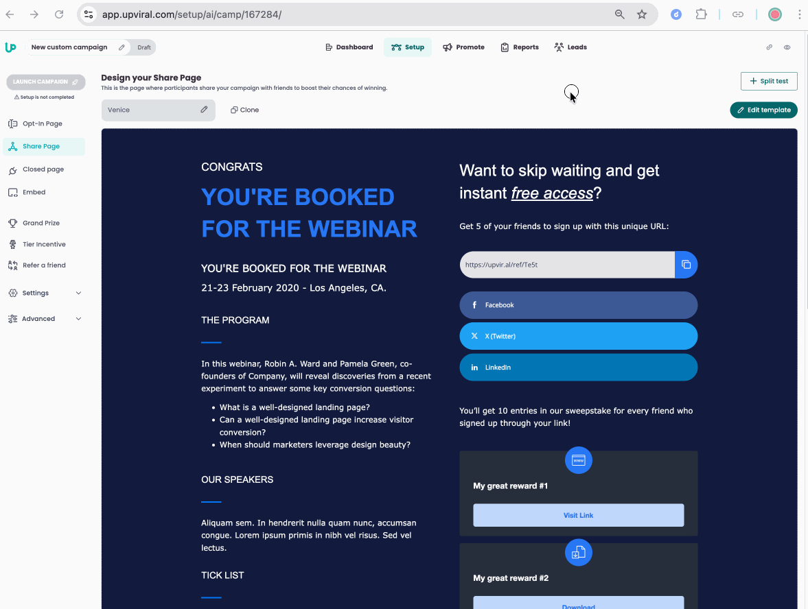 It's important to note that both the Opt-in page and the Share page need to be created during campaign setup. You cannot use one without the other. Therefore, it's recommended to create both pages before launching your campaign, whether you're integrating it on your website as a widget/HTML form or whether you're using an UpViral-hosted landing page template.