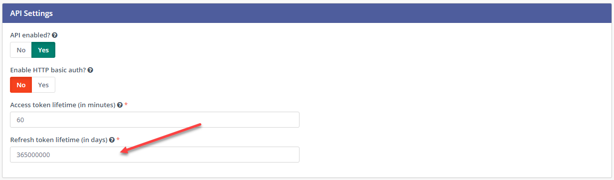 On the API settings page, go to the “Refresh Token Lifetime (in days)” dialogue box and put 365000000. Do not forget to save your changes.