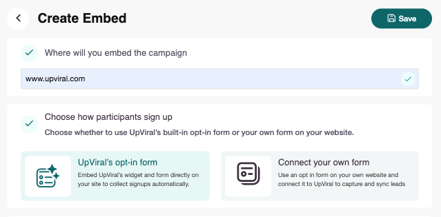 If you select "Connect your Own Form" in the previous step, you will be embedding the campaign via Universal Capture. This option is ideal if you already have an existing form with name and email fields.