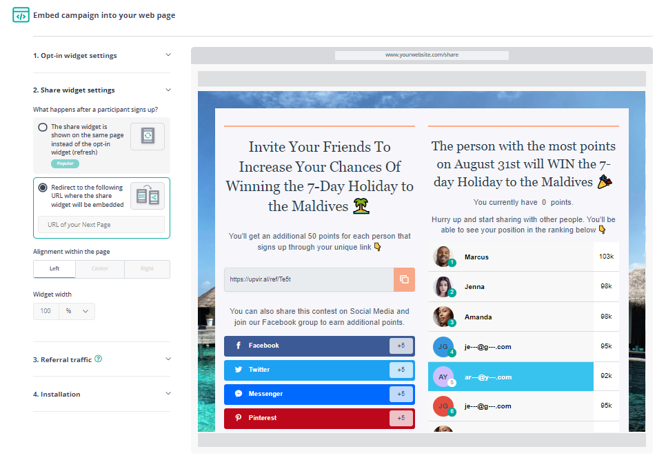3. The next step, "3. Share widget settings" is where you have two options. You can have the share widget appear on the same page as your opt-in popover widget or you can redirect it to the next page of your site. If you choose to redirect it to a different page then you need to add the page URL of where you want the share widget to appear after your participants have signed up.