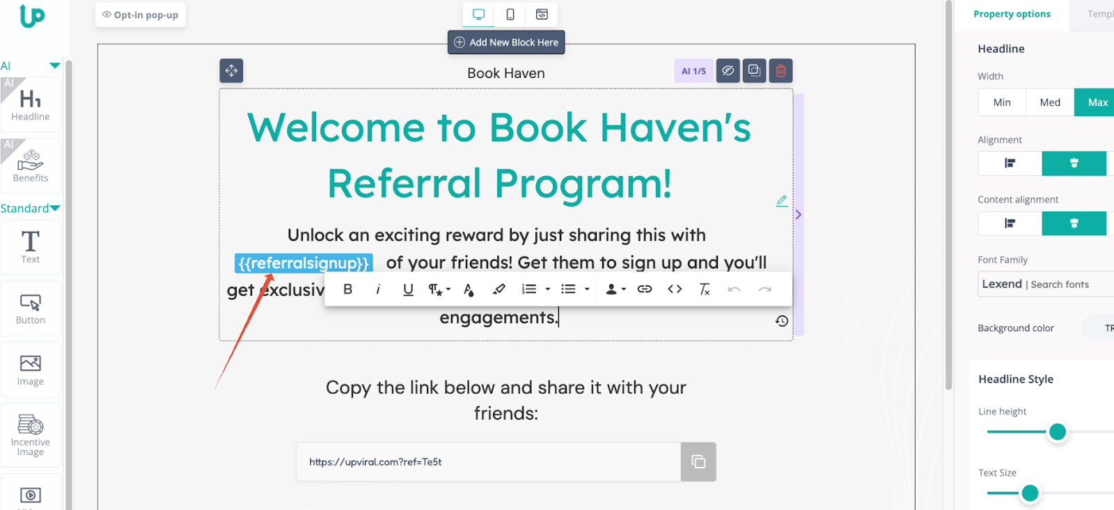 Choose the variable which you wish to add onto the page and the variable code would automatically appear on the page, which automatically calculates/counts the specific variable. Note: for example with {{referralsignup}}, it doesn't actually show the word {{referralsignup}} on the live page but it shows a number corresponding to the variable.