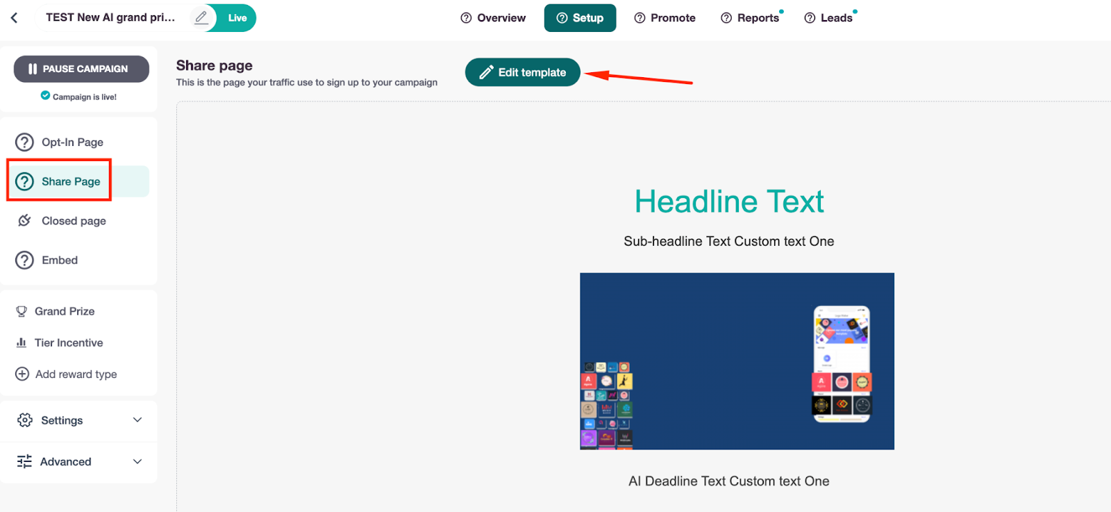 Step 1. Go to your campaign setup and click on the pencil icon to Edit Template of the share page.