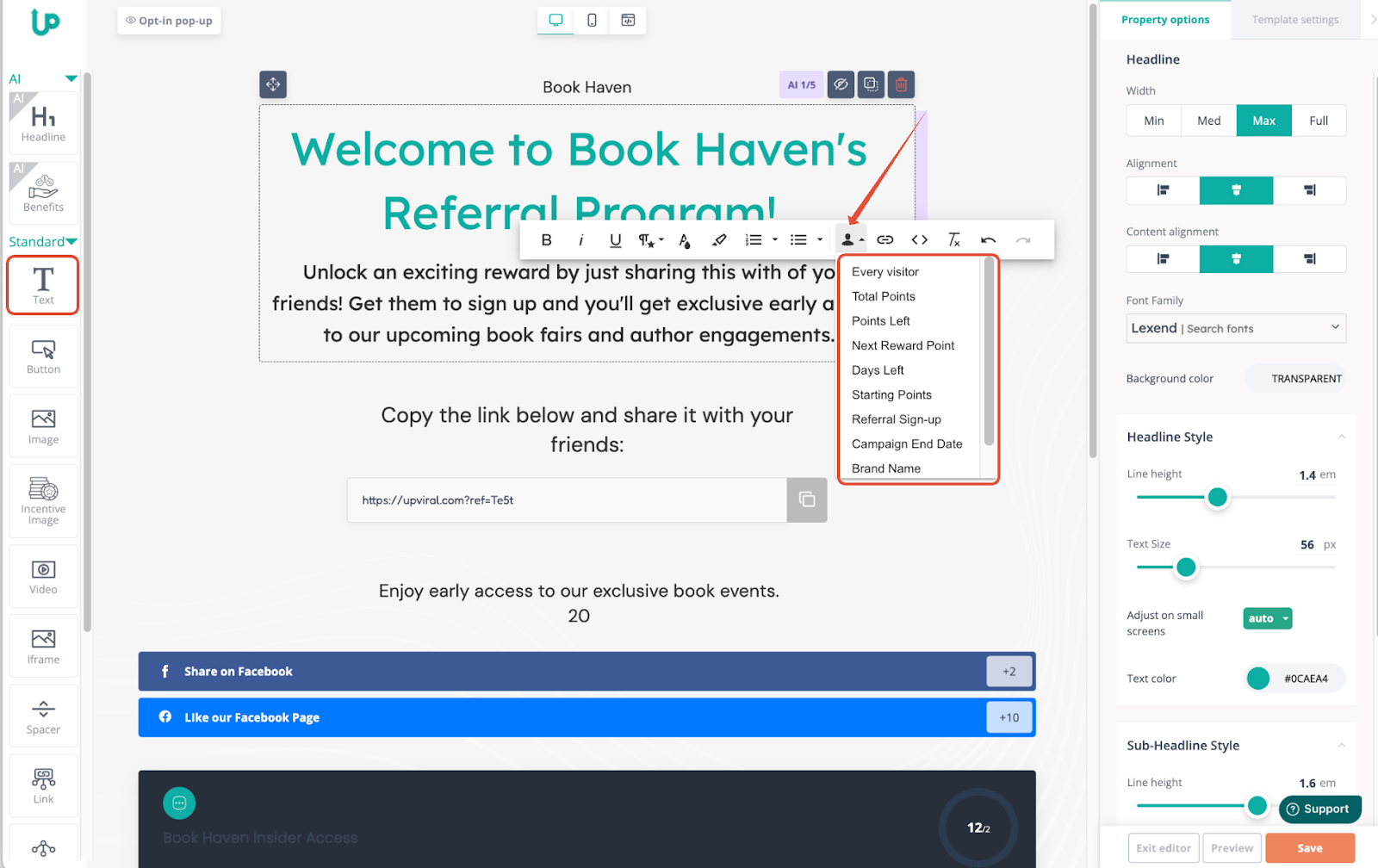 Step 2. If you don't have any text yet on your page, you can drag the text button on the left-hand sidebar and drop it onto the page to add text. If you already have text on your page, simply click on that text and a selector toolbar would appear, showing a human-shaped icon. Click on the icon and a list of variables would then appear.