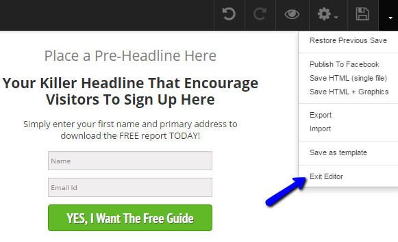 Exit out from the page editor by clicking the arrow pointing downwards and clicking Exit Editor.