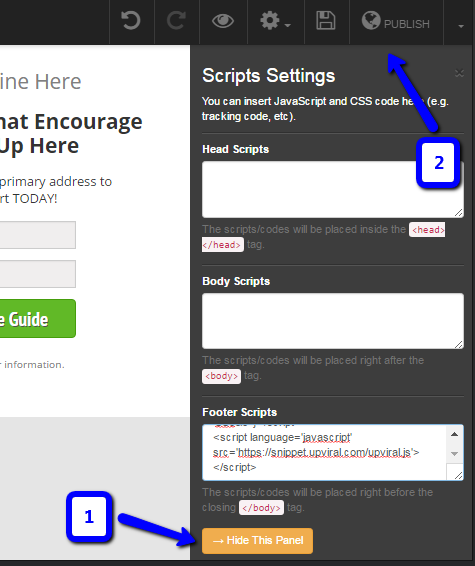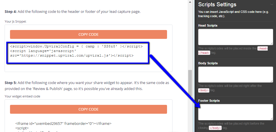 Go back to your Upviral campaign’s Embed page and copy the 2nd code from Step 4 and Add the code to the header or footer of your lead capture page and paste it under Footer Scripts of the Scripts Settings menu.