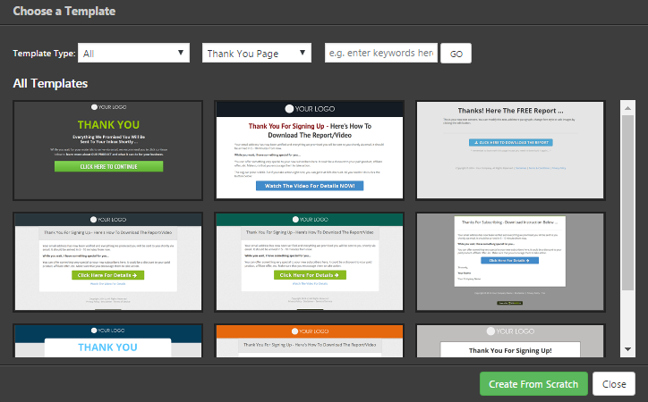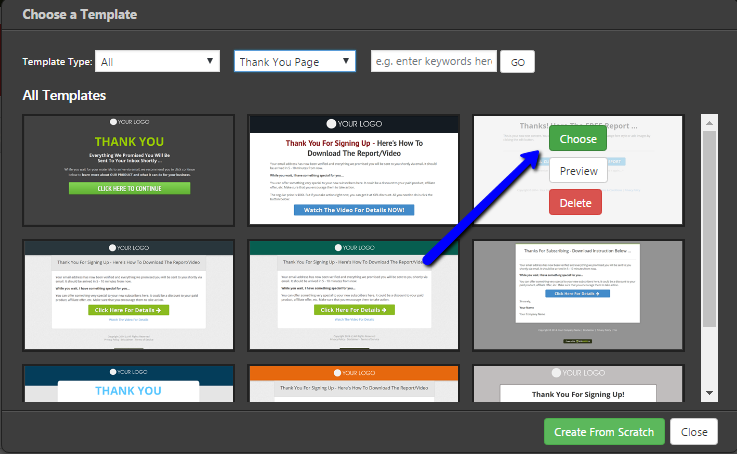 Choose a template. You can filter Thank You Page to only show thank you pages/templates.