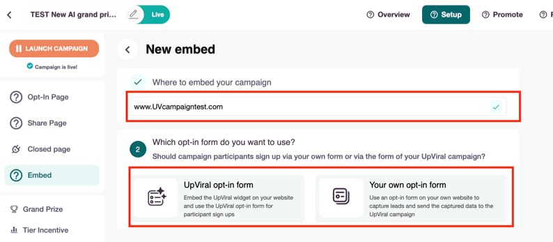 In the Where to embed your campaign field, type the URL of the website where you want the campaign to appear.