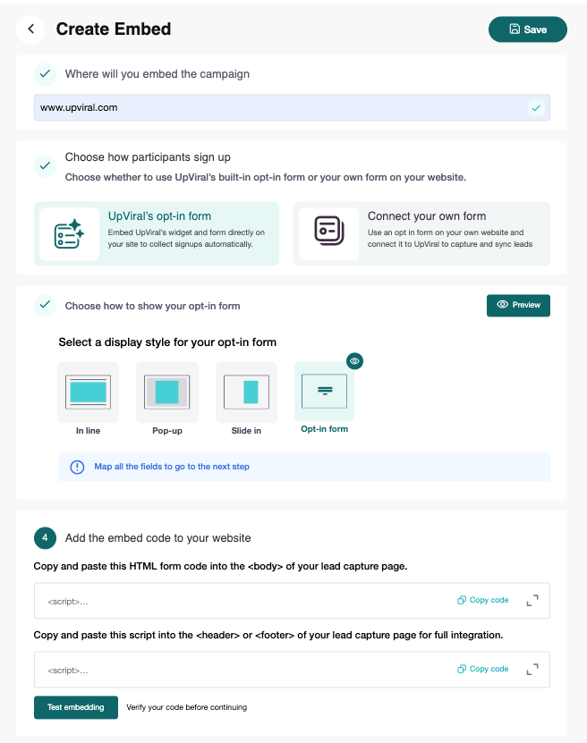 To display your UpViral campaign, add the following code snippets to your lead capture page: