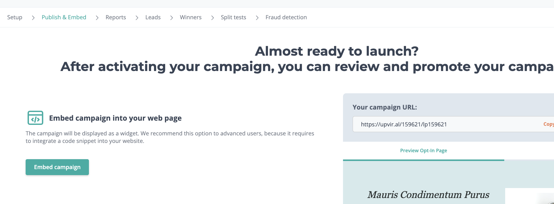 3. Log in to your Upviral Dashboard. Click on the "Embed campaign" button once you're on the Publish tab of your campaign.