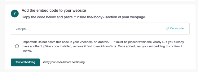 If an error message appears (e.g., detecting another UpViral code), remove the old code and add the new one.